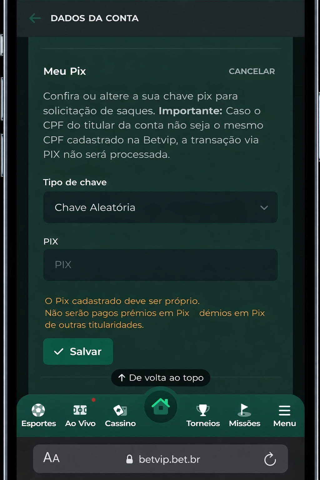 Para que a chave PIX seja aceita, é necessário que ela esteja vinculada ao CPF do titular da conta betvip. Chaves registradas em CPF diferente não serão aprovadas.