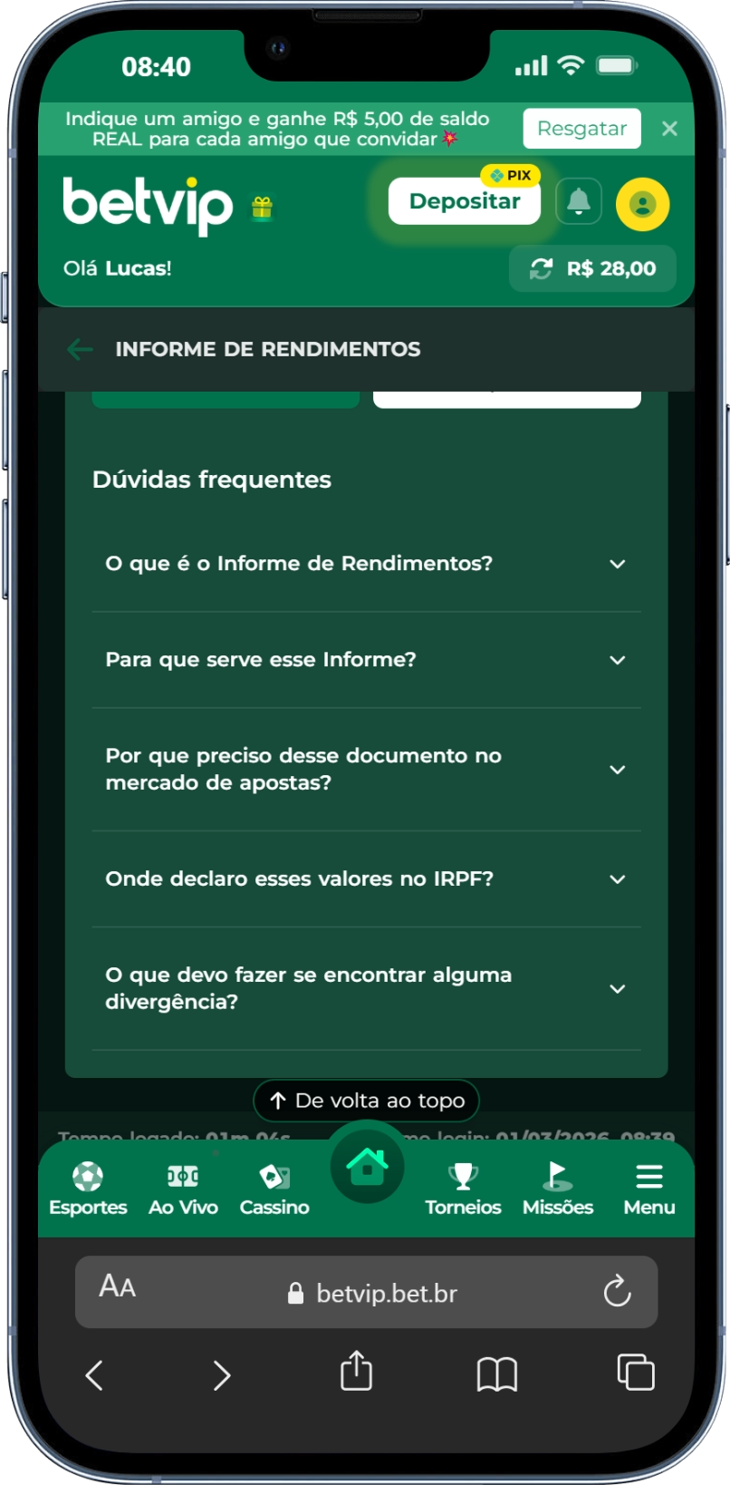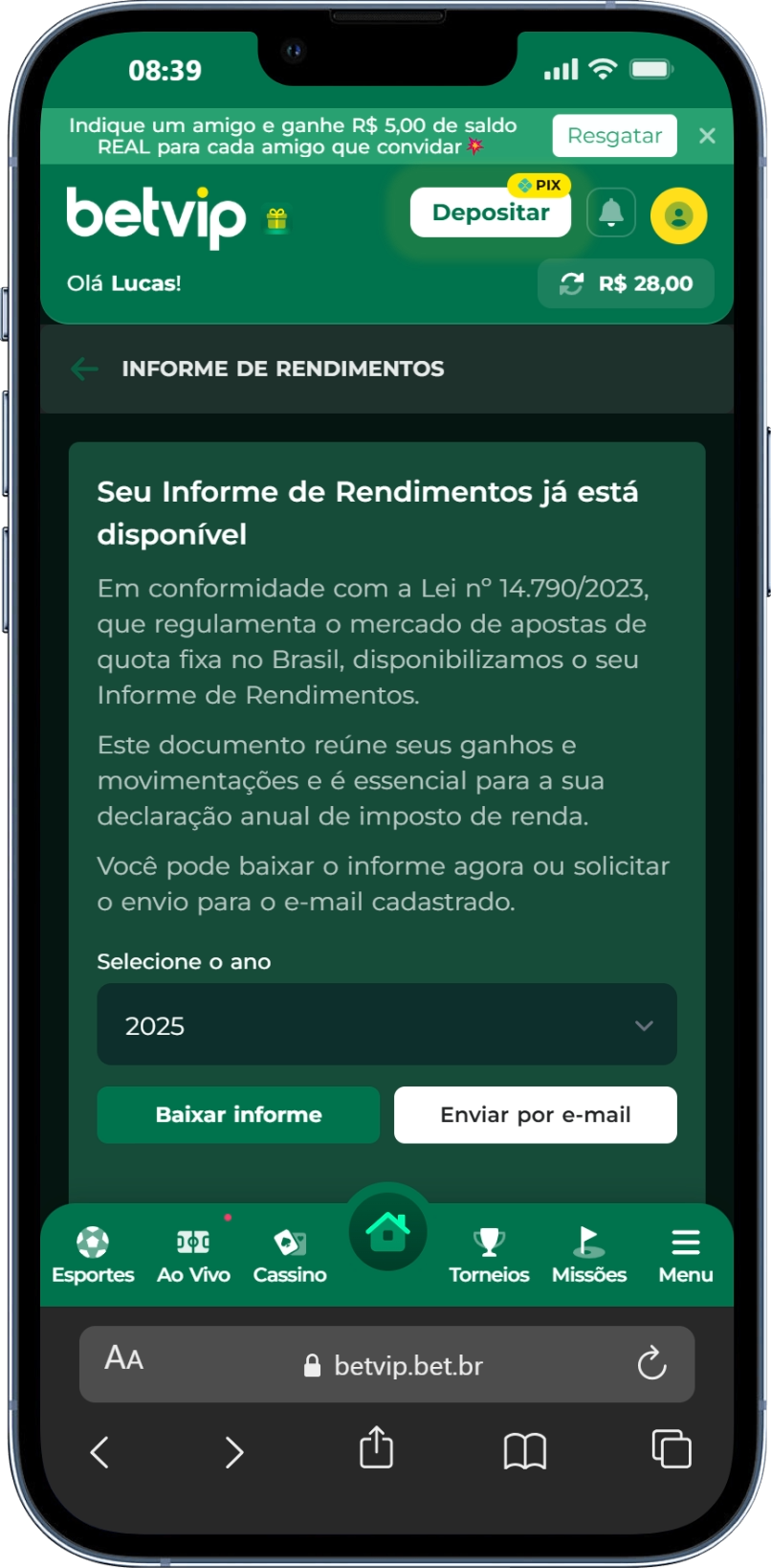 O Informe de Rendimentos é o documento oficial que resume seus ganhos e movimentações na Betvip durante o ano base. Ele é essencial para quem precisa realizar a declaração anual do Imposto de Renda (IRPF) junto à Receita Federal.